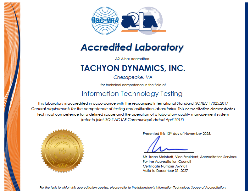 As an ISO 17025 accredited test lab, Tachyon Dynamics is able to provide world-class IPv6 product certification to product vendors trying to achieve the U.S. Government IPv6 (USGv6) certification. Details on this certification are located here: https://www.nist.gov/programs-projects/usgv6-program/usgv6-revision-1